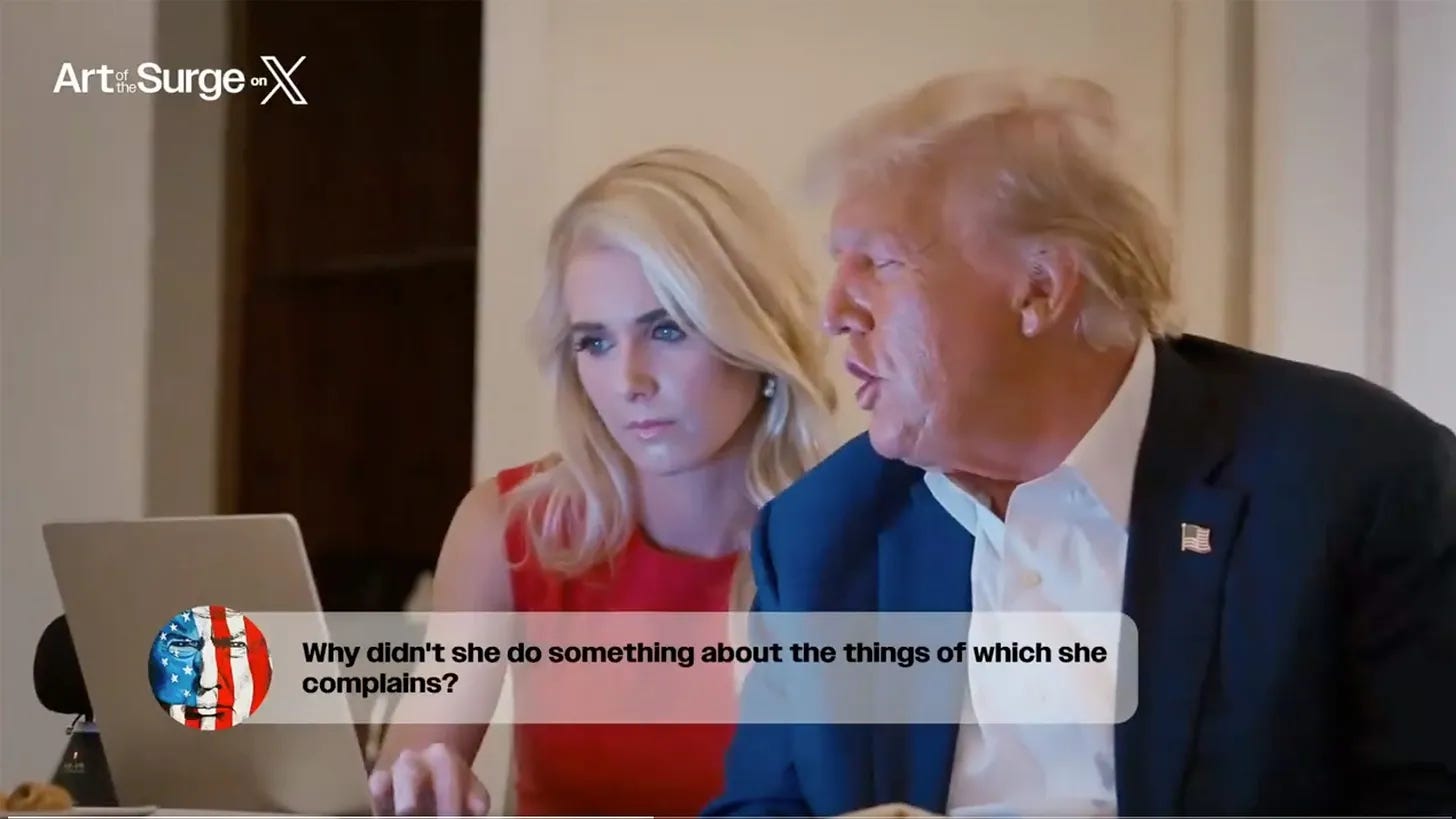 英国首相のソーシャルメディア顧問であるキャス・ホロウィッツがシェアしたこの映像は、ハリスの演説中に、トランプがソーシャルメディアへの投稿内容を口頭で指示している様子を示している。これについてホロウィッツは「世界のリーダーとして珍しいアプローチである」と述べ、Prof G Marketsの共同ホスト、エド・エルソンは「"人"こそがブランドになる」と指摘している。